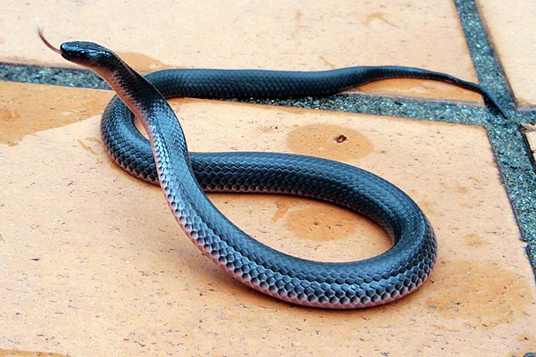 Small black eyes barely discernible from surrounding dark scales. Colour generally glossy dark grey to black with cream or pink belly, sometimes with dark spots. Belly colour does not extend up onto sides, and is not visible as it is on the Red-bellied Black Snake. Midbody scales at 15 rows.