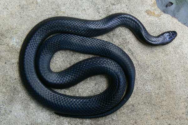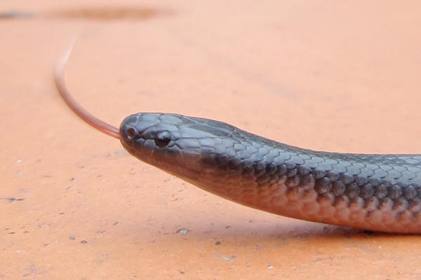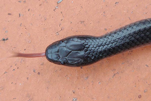 Small black eyes barely discernible from surrounding dark scales. Colour generally glossy dark grey to black with cream or pink belly, sometimes with dark spots. Belly colour does not extend up onto sides, and is not visible as it is on the Red-bellied Black Snake. Midbody scales at 15 rows.